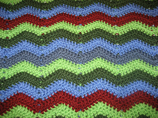 Pattern: Soft Waves from the 200 Ripple Stitch Patterns, edited by Jan Eaton. I did 24 repeats across and 84 stripes, each stripe being 2 rows.